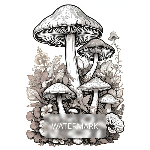 A grayscale illustration titled "Enchanted Forest Flora" depicts a variety of mushrooms towering amidst a flourishing undergrowth.