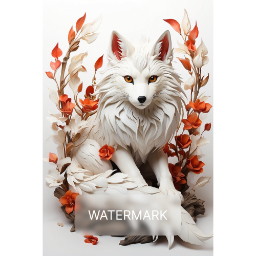 The artwork depicts a majestic white fox, its fur as pristine as snow, with piercing amber eyes. Surrounded by warm autumn leaves and delicate flowers, it embodies the serene spirit of the forest.
