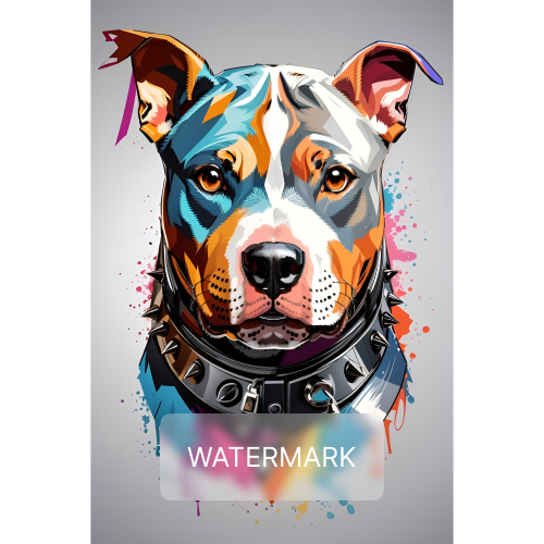 A dog’s portrait bursts with a spectrum of vivid colors, each hue flowing into another, creating a vibrant mosaic. The studded collar adds an edgy contrast to the softness of its gaze, encapsulating a modern, artistic spirit.