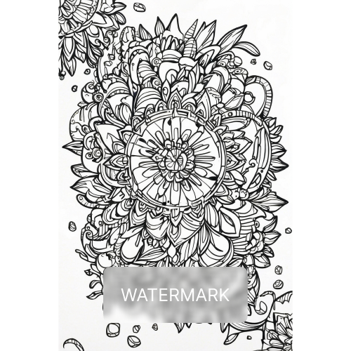Crystal Harmony Mandala” is an intricate black and white artwork featuring a central flower-like pattern surrounded by layers of ornate petals, mirrored gemstones, and swirling designs, symbolizing unity and balance.