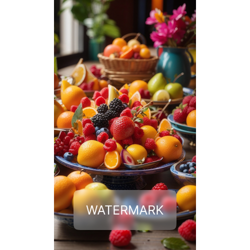 A bounty of fresh fruit graces patterned blue porcelain, the vivid oranges, yellows, and reds of citrus and berries popping against the intricate designs. Lush greenery adds a touch of nature’s artistry to the scene.