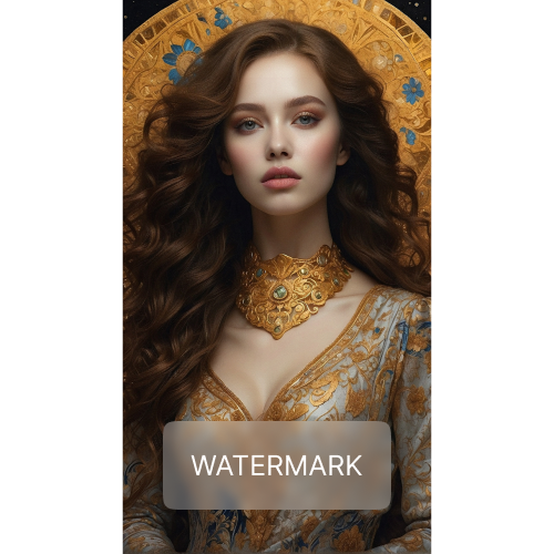 An exquisite portrait of a woman embodying nobility, with luscious wavy hair, dressed in a golden embroidered gown, complemented by an ornate necklace. Her halo suggests a touch of the divine.