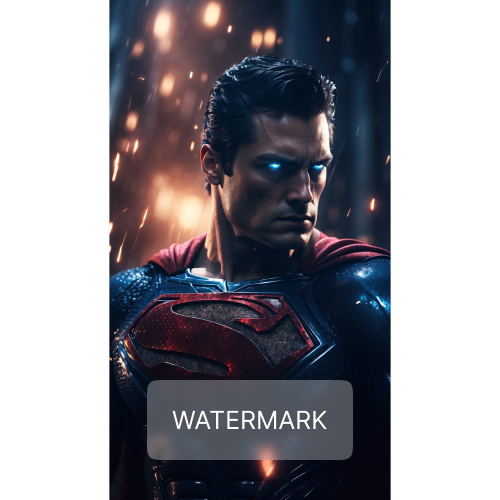 In the heart of a fiery storm, a hero with a steely gaze stands resilient. His eyes glow with an otherworldly blue light, reflecting his exceptional powers. Rain and embers dance around him, as the iconic emblem on his chest shines with hope and strength.