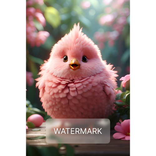 A plump, fluffy bird with soft pink feathers stands amidst a serene garden, its large, curious eyes sparkling with innocence.